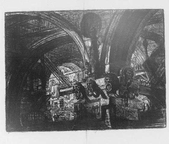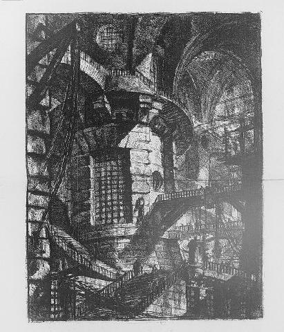 Der Gang mündete schließlich in eine lange rechteckige Halle mit flacher Decke, deren Längswände in regelmäßigen Abständen mit Pilastern untergliedert waren. In der Mitte dieser beiden Wände befand sich je ein hohes marmornes Portal, das üppig mit Ornamenten aus kleinen Elementen, die sich ständig wiederholten, geschmückt war. Die Portale waren vollkommen gleich. Sie unterschieden sich nur dadurch, dass über dem einen ein Kreis und über dem anderen eine liegende Acht angebracht war. Piranesi trat durch das Portal mit dem Kreis und fand sich in einem riesigen Raum, dessen Struktur ihm sofort merkwürdig unklar erschien. Unmittelbar vor ihm erhob sich eine mächtige Wand aus zyklopischen Steinquadern, in die mit gewaltigen Lettern tief die Worte „Quid est spatium?“ eingemeißelt waren. Darüber thronte eine große Figur, welche mit dicken Ketten an die Wand gefesselt zu sein schien. In die Höhe und die Tiefe führten allerhand Treppen. Außerdem wurde der Raum von mehreren übereinander gestaffelten hölzernen Galerien und Brücken durchquert, die auf jeder Ebene Verbindungen in alle Richtungen herstellten. Piranesi vermutete, dass dieses Gewirr von Verbindungen der Grund dafür war, dass er die Begrenzung des Raumes nicht einzuschätzen vermochte. Auch seine Funktion wurde ihm nicht deutlich. An Wänden, Balken und Brücken waren allenthalben schwere Eisenketten, dicke Seile und Ringe angebracht, wie man sie von Häfen kennt, in denen außerordentlich große Schiffe festzumachen sind. Unmittelbar vor ihm befand sich in horizontaler Lage ein riesiges Rad, das mit seinen senkrecht angebrachten martialischen Spitzen ein Folterinstrument für Riesen zu sein schien.