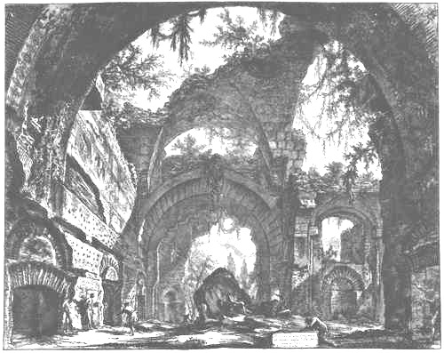 Die Wirklichkeit freilich hielt dieser Vorstellung nicht stand. Piranesi fand die Überreste der antiken Bauten meist weit weniger vollständig und wohlerhalten, als es die peniblen Zeichnungen Palladios suggerierten. Viele waren in Wehranlagen der ewig befeindeten römischen Stadtgeschlechter aus dem Mittelalter versteckt, waren in Kirchen eingebaut oder lagen unter Palästen aus neuerer Zeit. Soweit Gebäude noch über ein Dach verfügten, dienten die alten Räumlichkeiten häufig Handwerkern und sonstigen Gewerbetreibenden als Arbeitsstätte oder Lagerraum. Eines Tages etwa geriet Piranesi mit dem französischen Ruinenmaler Hubert Robert, mit dem er sich, da man das Interesse an den alten Resten teilte, angefreundet hatte, in eine weiträumige düstere Basilika, wo Wäscherinnen unter kassettierten Tonnengewölben, welche von einer Vierungskuppel unterbrochen waren, für die hohen Herren der Stadt bei offenem Feuer und großer Rauch- und Dampfentwicklung riesige Laken in einem Zuber kochten, die sie anschließend zwischen mächtigen Säulen zum Trocknen aufhängten. Was von den alten Bauten nicht auf diese Weise zweckentfremdet, was nicht gänzlich umgestaltet oder abgetragen war, lag versunken im Schutt der Jahrhunderte, aus dem nur hier und da verwitterte Reste ragten. Ein Römergeschlecht, das wenig gemein hatte mit dem Heldenvolk, das diese Bauten erstellt hatte, hauste dazwischen samt allerhand Getier in Unterkünften, die aus vorgefundenen Steinquadern und Ziegeln zusammengestückelt waren, zwischen denen hier und da Säulentrommeln oder behauene Sims- und Gebälkteile steckten. Auf dem Forum Romanum, auf dem einstmals Weltpolitik gemacht wurde, weidete man Vieh, weswegen es „campo vaccino“, Feld der Kühe, genannt wurde.